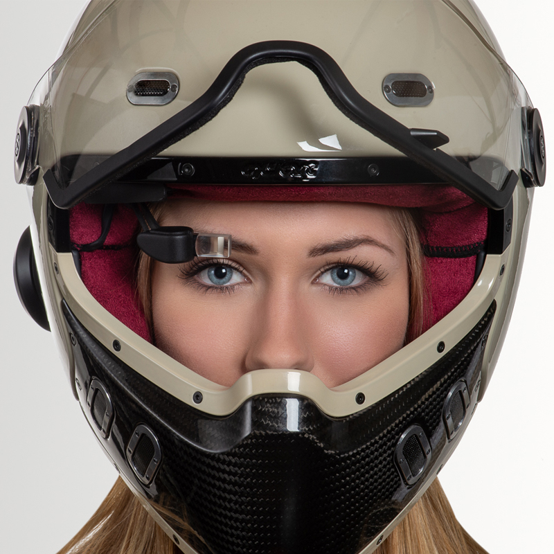 Head-up display compatible with all types of headphones and glasses: GPS, Intercom and music in your field of sight, controlled by voice control.